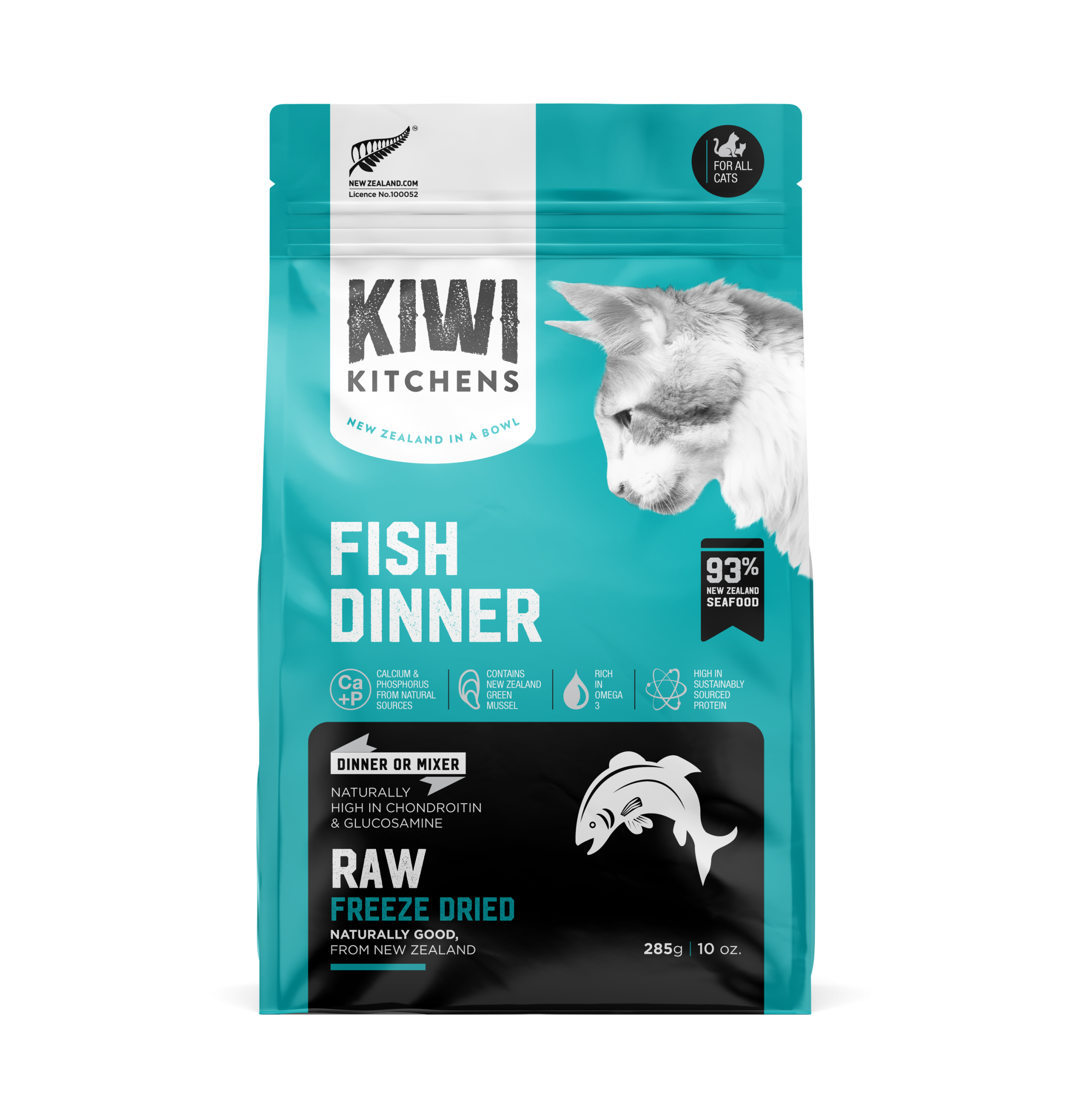 Salmon, Fish (Hoki and Ling), Tuna, Ling Liver, Flaxseed, Fish Bone, New Zealand Green Mussel, Mussel Digest, Sunflower Oil (preserved with mixed tocopherols), Potassium Chloride, Salt, Dried Seaweed, Taurine, Mixed Tocopherols (preservative), Choline Chloride, Chickpea, Magnesium Oxide, Zinc Proteinate, Iron Proteinate, Vitamin E Supplement, Copper Proteinate, Niacin Supplement, Sodium Selenite, Manganese Proteinate, Pantothenic Acid, Riboflavin, Thiamine Mononitrate, Pyridoxine Hydrochloride, Vitamin B12 Supplement, Folic Acid, Calcium Iodate.
