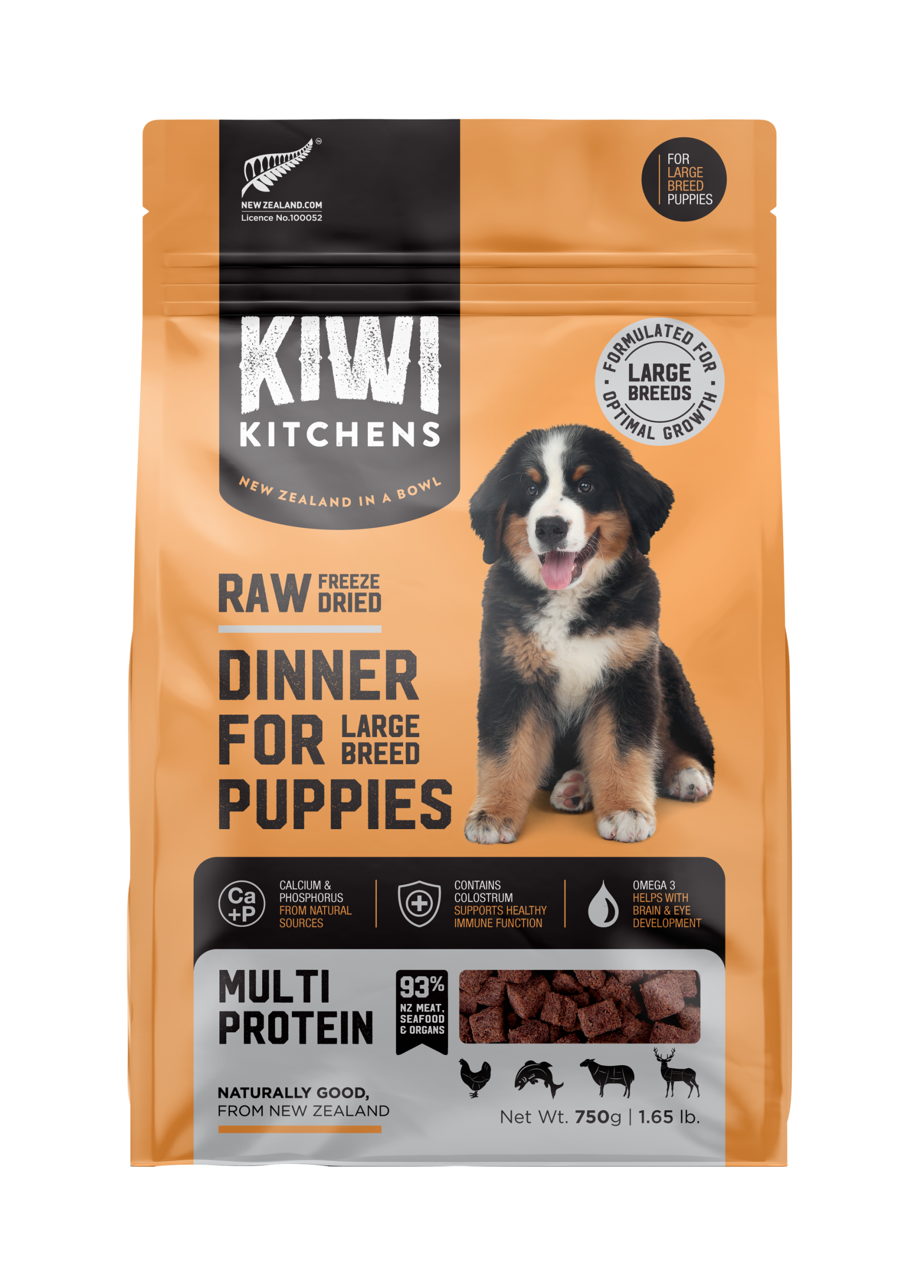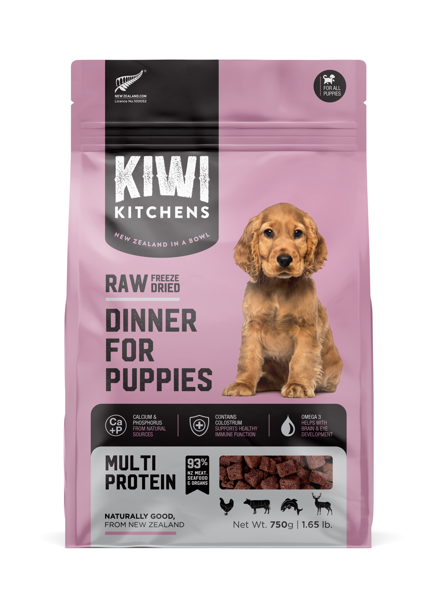 Kiwi Kitchens RAW Freeze Dried Puppy Food is made from high quality whole foods sourced entirely from the farms and waters of New Zealand. Along with a variety of high-quality proteins, we also include New Zealand Green Mussel, Goat Milk, Fish Oil, Pumpkin, Kiwifruit, Coconut Oil, Broccoli, Blackcurrants and Colostrum.