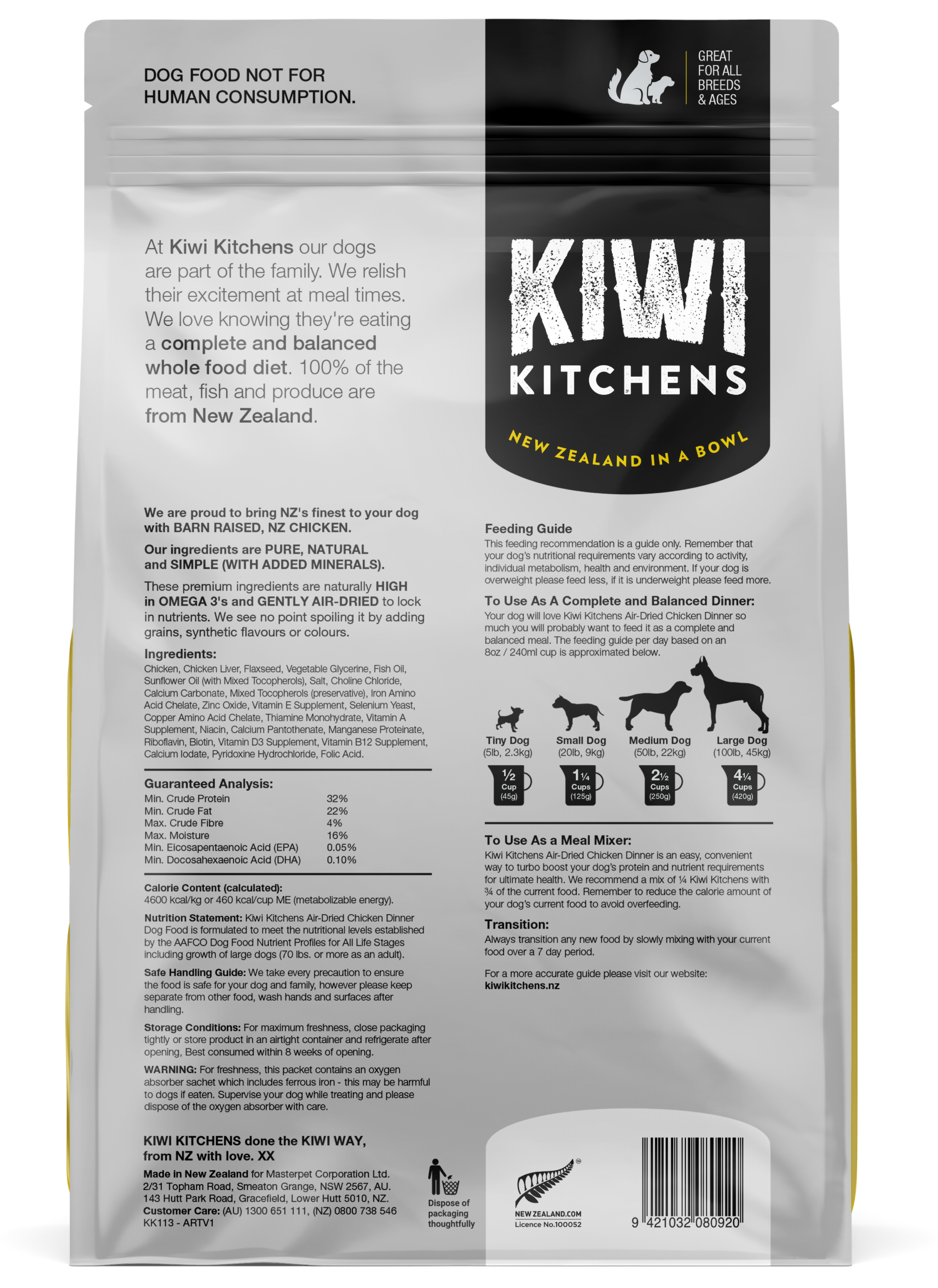 Your dog will love Kiwi Kitchens Air-Dried Chicken Dinner so much you will probably want to feed it as a complete and balanced meal. The feeding guide per day based on an 8oz / 240ml metric cup is approximated below.